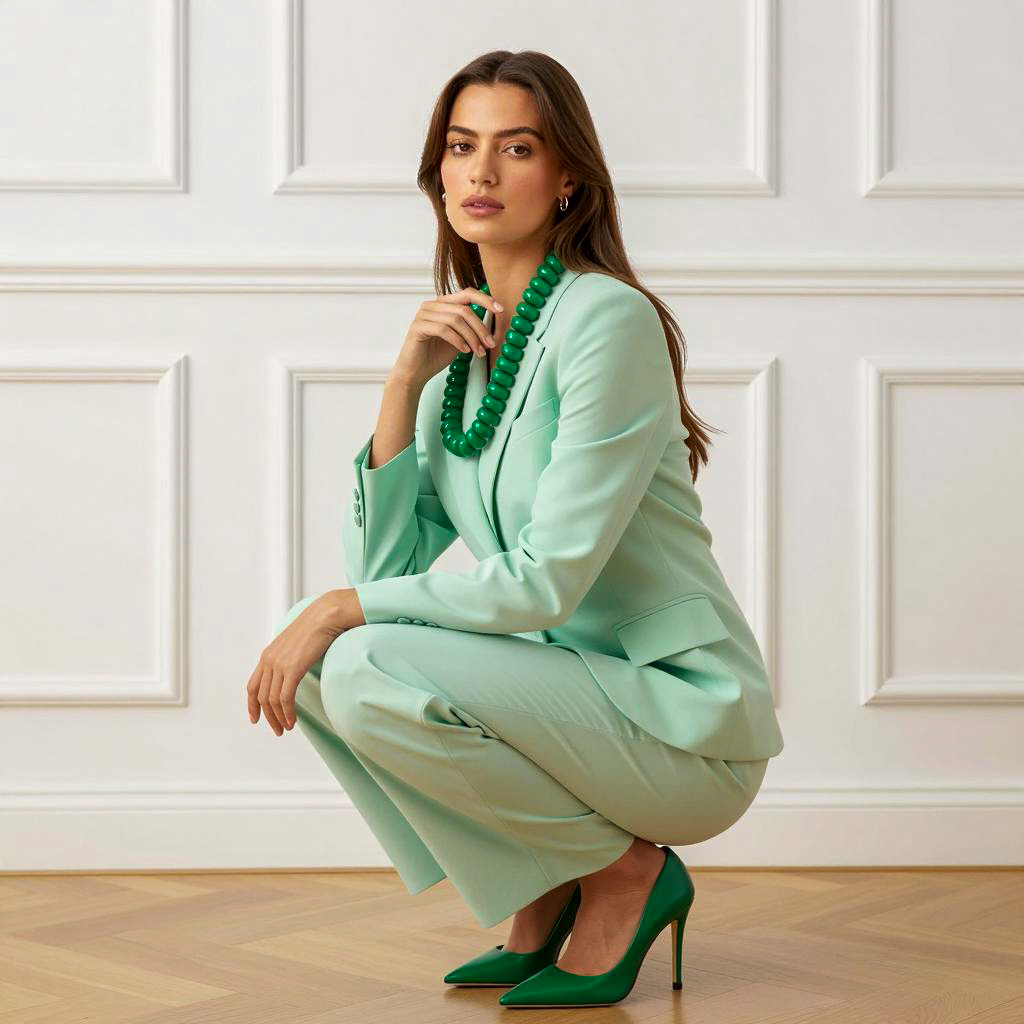 Woman in photograph, crouching, wearing light green pantsuit, green high-heeled shoes, and holding a large green coil necklace. Long straight brown hair, neutral facial expression. White paneled background, light wooden floor. Green color coordination. Refined, modern style.