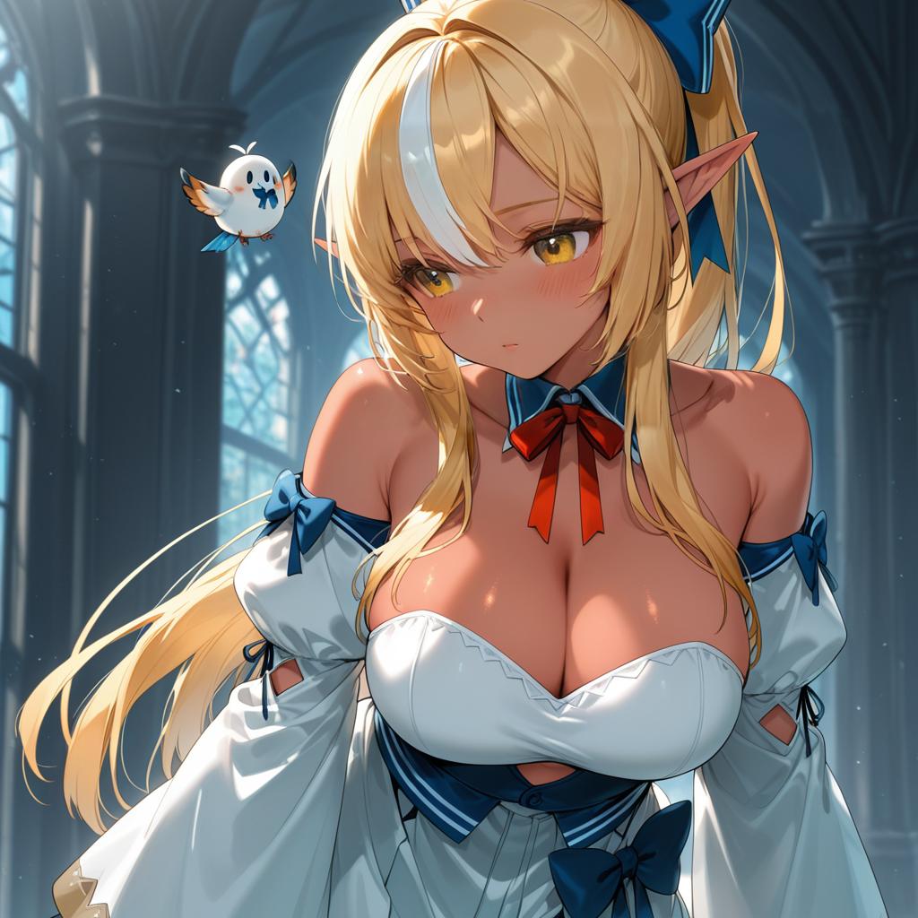 Elfriend (shiranui flare), hololive, 1girl, dark-skinned female, red eyes, orange eyes, streaked hair, blonde hair, long hair, white hair, sidelocks, ponytail, high ponytail, hair bow, large breasts, cleavage, white dress, blue bow, bare shoulders, detached sleeves, long sleeves, virtual youtuber, virtual youtuber, elf, bird, dark elf, by artist naso4, dark_illustrious