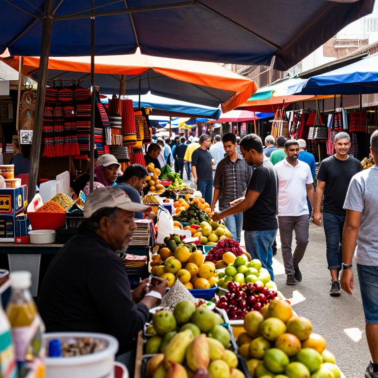 Vendors bustling in a vibrant open-air market, colorful stalls overflowing with fresh fruits, spices, and handmade crafts, sunlight filtering through vibrant awnings, lively crowd interacting, capturing the hustle and cultural richness of street commerce in detailed realism.