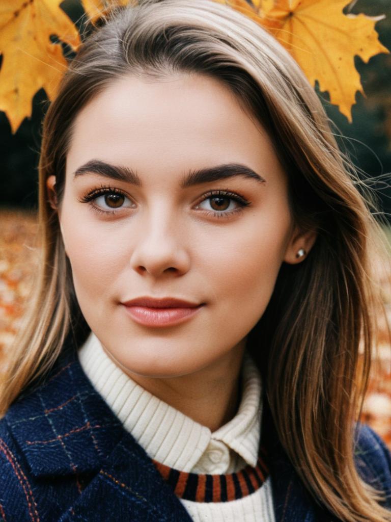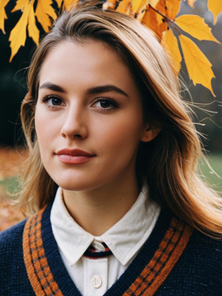 Woman in Preppy Fall Outfit, close-up headshot with warm tones