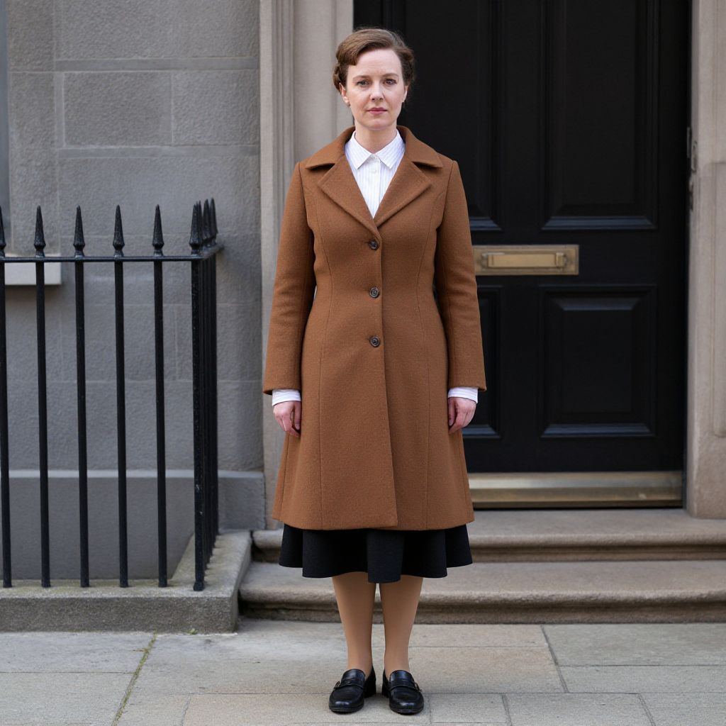 Photograph of a middle-aged woman standing in front of a black door with a brass mail slot, set in a stone building. She has fair skin, brown hair in an updo, and wears a brown, knee-length, double-breasted coat with black buttons over a white shirt and black skirt. She also wears black shoes and has a serious expression. A black, wrought-iron fence is to her left, and the stone ground is visible beneath her. The overall style is classic and formal.