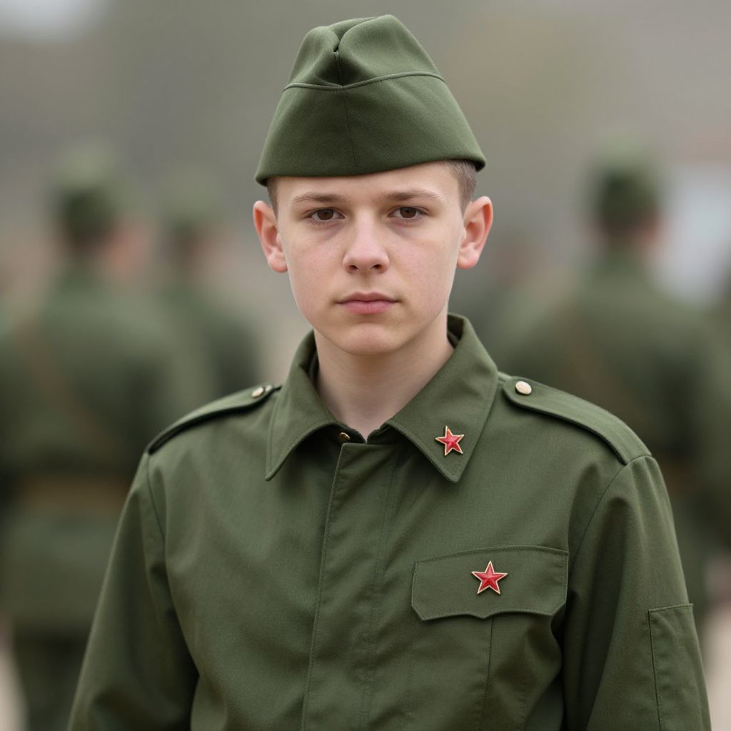 Photograph of a young Caucasian boy with fair skin and short brown hair, wearing a dark green military-style uniform with a matching cap. The uniform features two red star emblems on the chest and left shoulder. His expression is neutral, with a slight hint of seriousness. The background is blurred, showing other similarly dressed individuals in green uniforms, suggesting a military or school setting. The overall lighting is natural, with an overcast sky. The image has a realistic, documentary style.