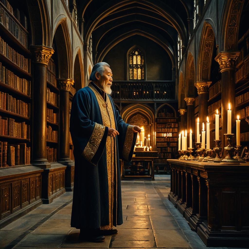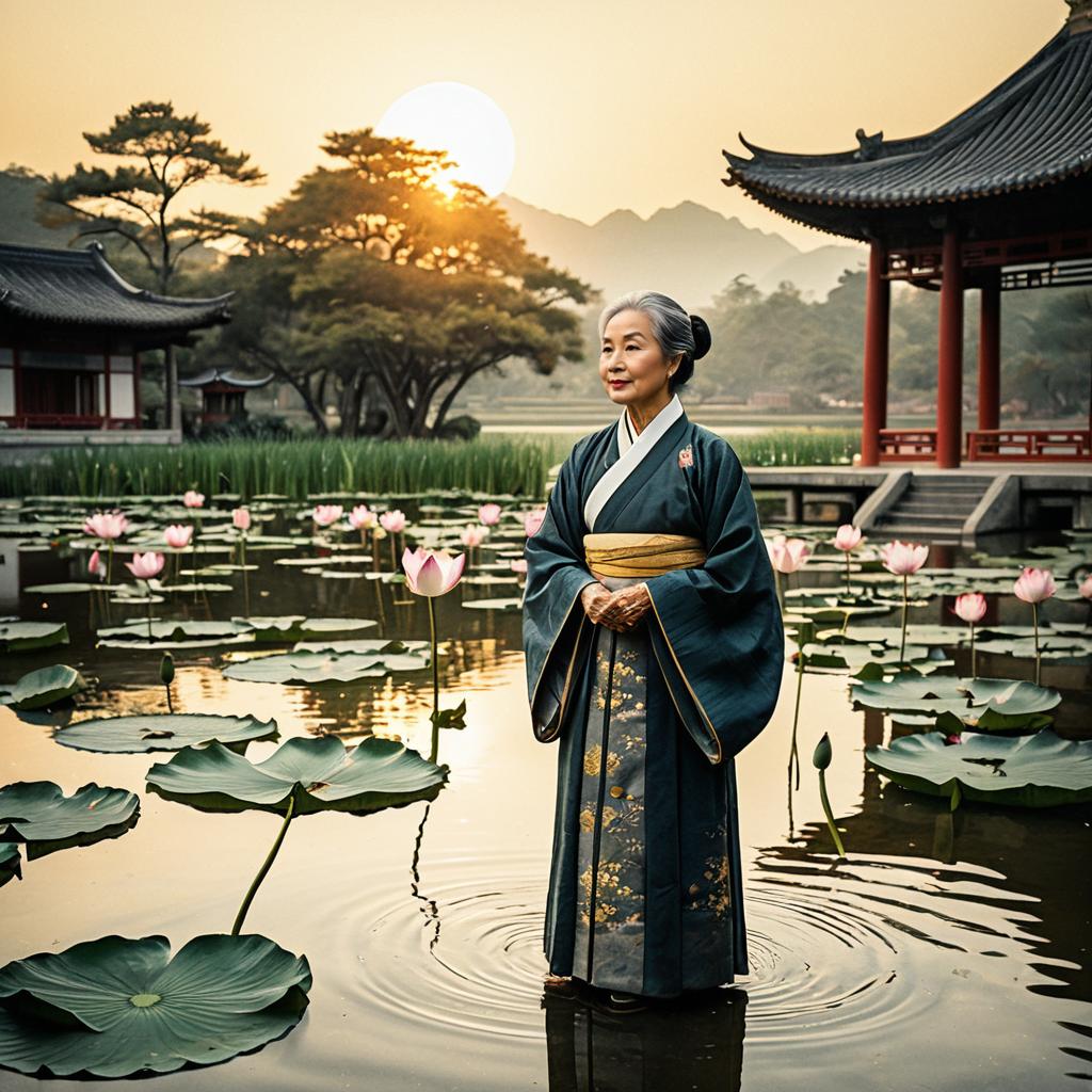 Elderly Asian Woman in Traditional Hanfu at Lotus Pond Sunset