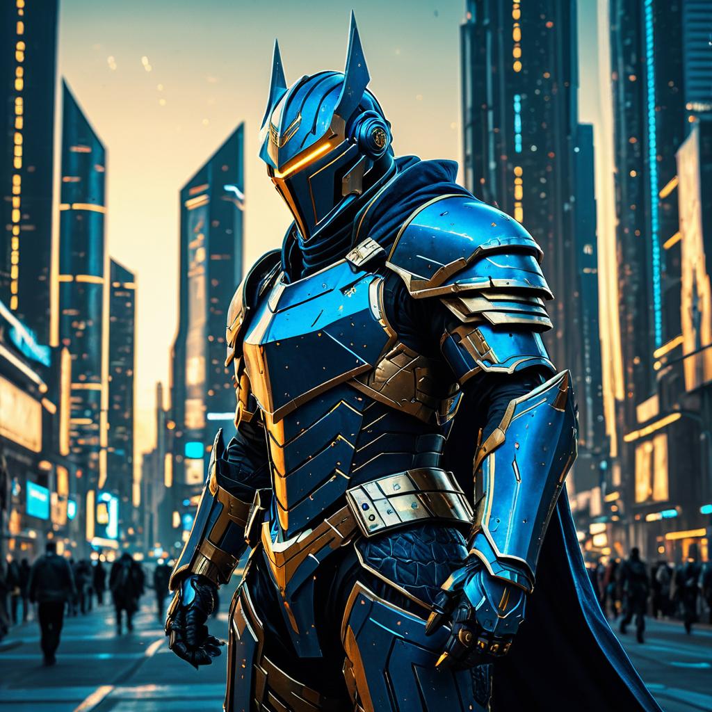An elderly Asian woman dressed in a traditional dark blue Hanfu with golden accents, standing gracefully in a serene lotus pond during sunset. The background features traditional East Asian architecture, lotus flowers, and trees, with soft sunlight filtering through the scene. The image showcases intricate fabric details and smooth lighting, emphasizing cultural heritage and peaceful ambiance.