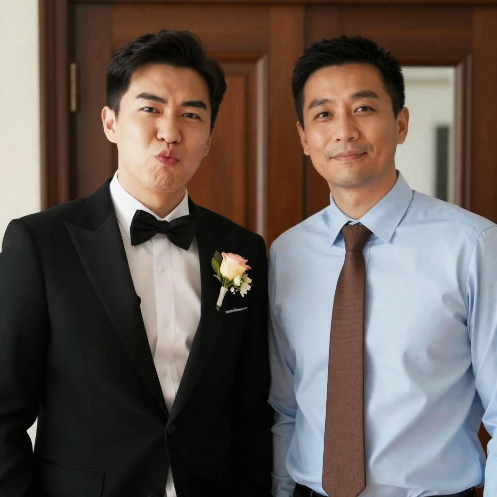 Photograph of three men in black tuxedos with white shirts and black bow ties, standing close together against a white background. The man on the right smiles, the man in the middle has a neutral expression, and the man on the left looks to the side with a slight smile. All have short, dark hair.