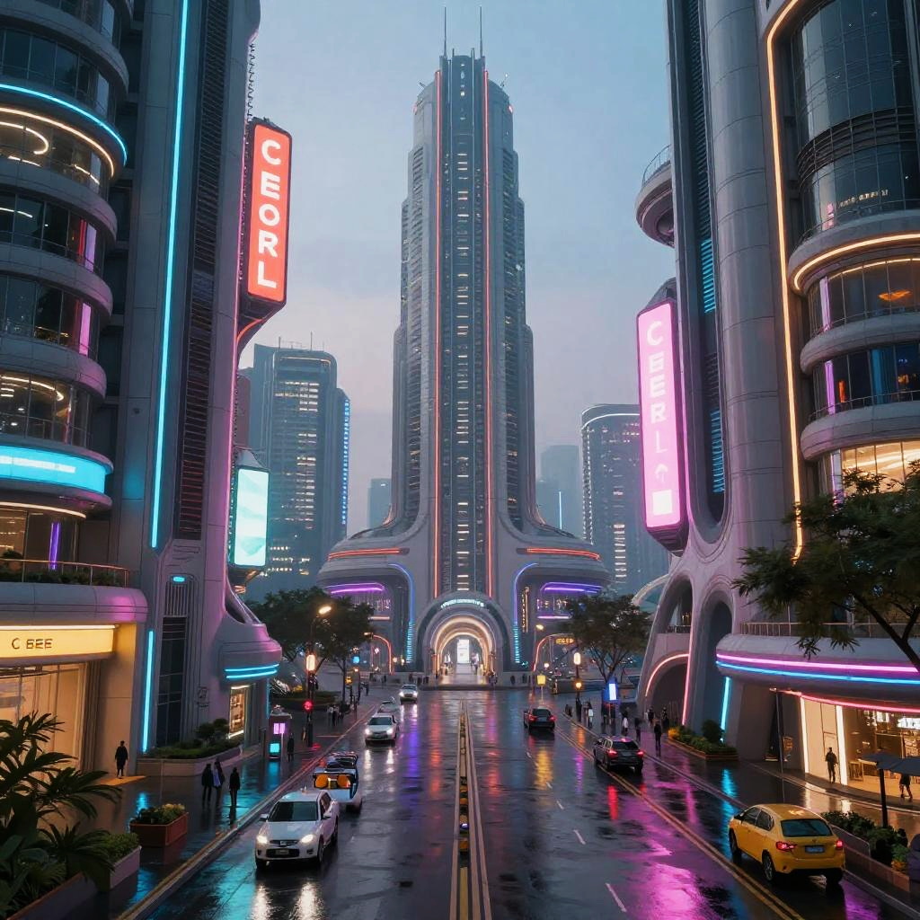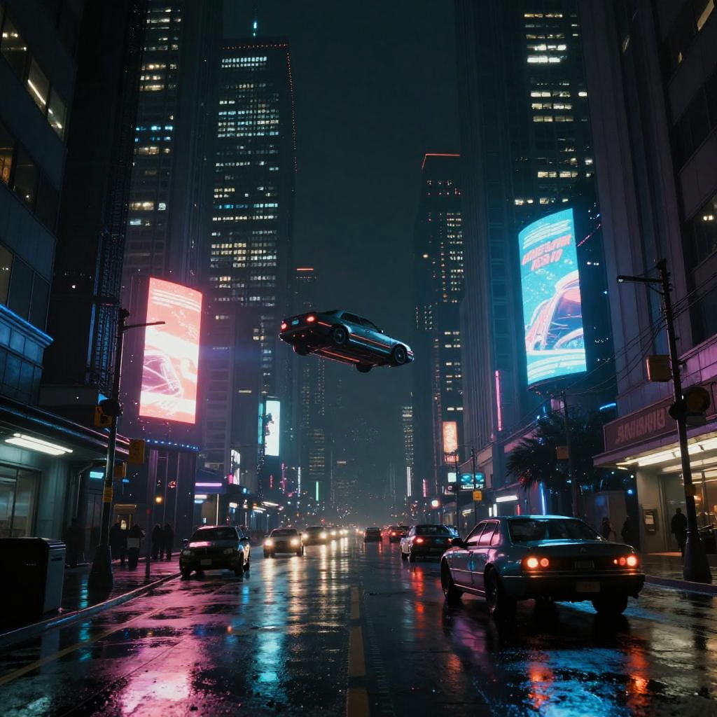 Detailed cyberpunk city layout featuring multilevel streets, flying cars, massive digital billboards, and cybernetic street vendors, dark alleys illuminated by pulsating neon, rainy weather creating reflective puddles on the pavement, an immersive high-tech metropolis