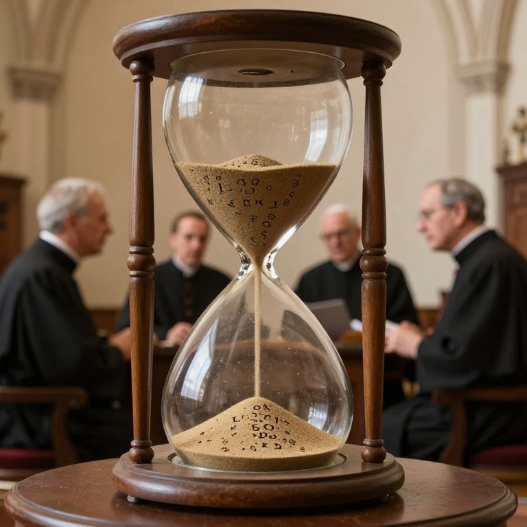Archbishops debate theology inside a giant hourglass where the sand is composed of ancient letters never sent.