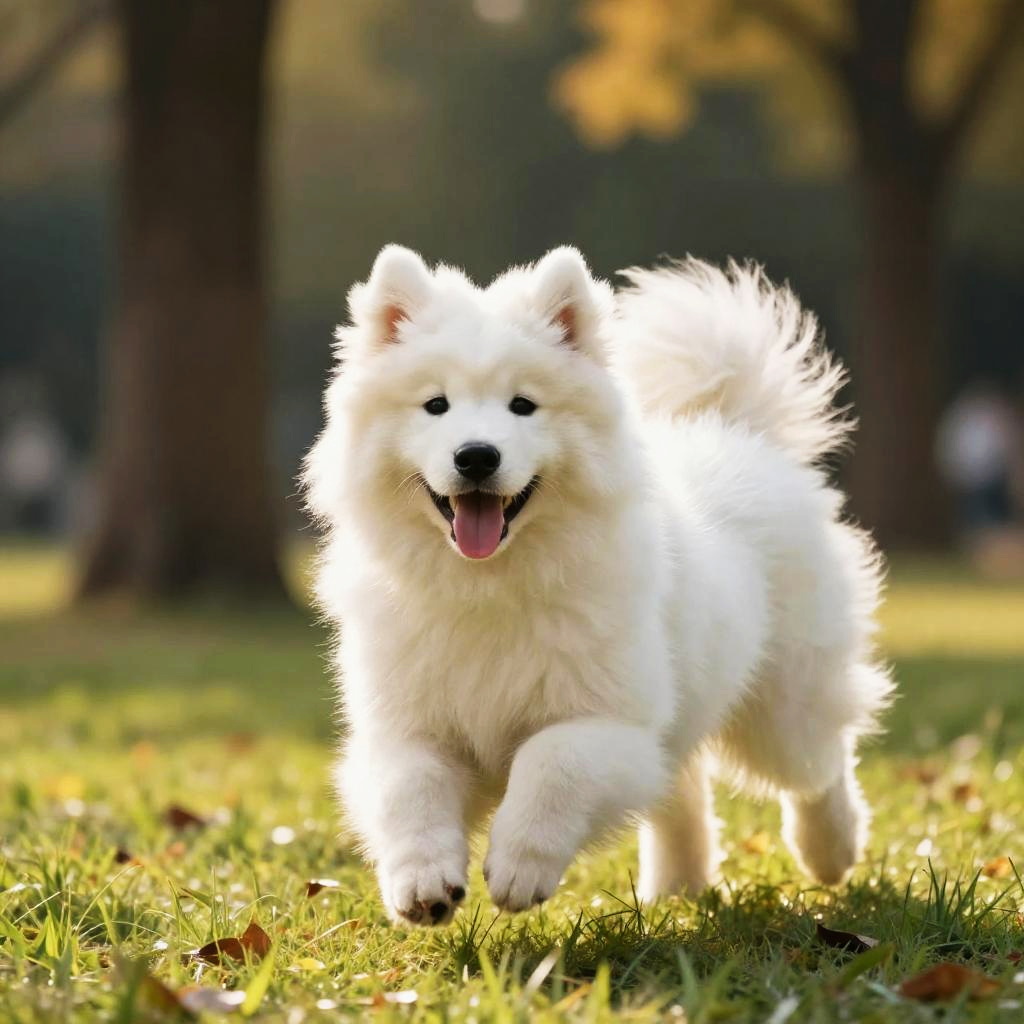 Wildlife Photography 8k photo captured with a high end 80mm lens and a soft focus filter, warm tones, playful Samoyed puppy, fluffy snow-white coat, smiling Samoyed grin, perky ears, curled fluffy tail, playful mid-bounce with tongue out, sparkling dark eyes, sunlit fur enjoying a sunny day at the park, tall trees and green grass in the background, natural light should illuminate the scene, with a gentle fill flash to accentuate the dog's features,