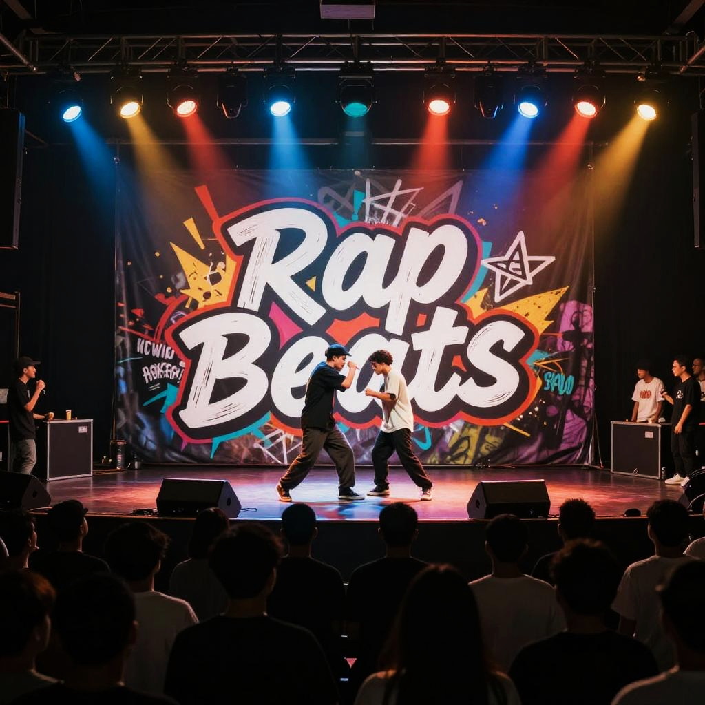 Rap YouTube banner illustrating a fierce rap battle stage in an underground club, intense spotlights and a crowd silhouette, graffiti backdrop with bold lettering spelling 'Rap Beats', edgy and raw atmosphere with a street style flair.