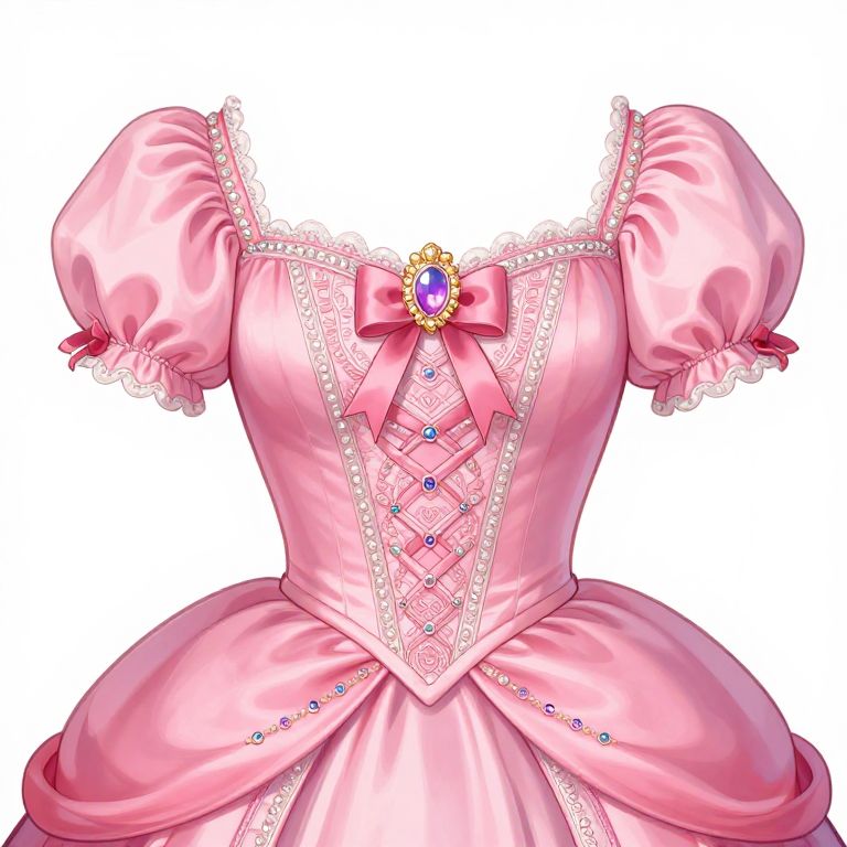 Digital illustration of a pink, Victorian-style dress with puffed sleeves, lace trim, diamond-patterned bodice, purple gem brooch, and ribbon