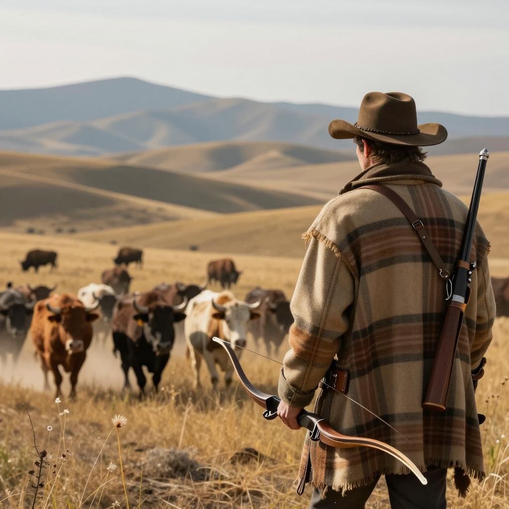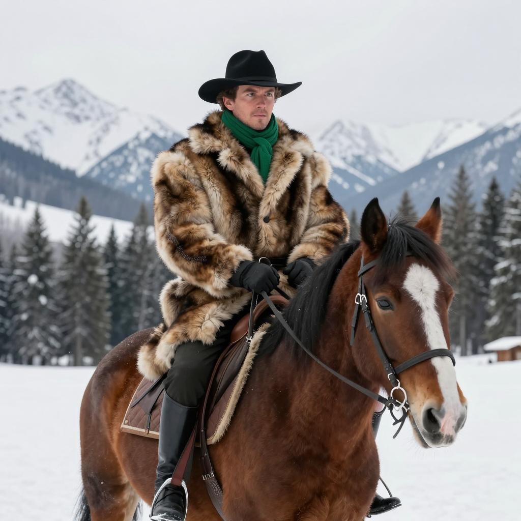 Man standing in snow, wearing brown hat, red coat, blue pants, black boots, holding rifle in right hand, leaning on stick. Snow-covered ground, log cabin to left, dry branches in background. Daytime, sunlight casting shadows. Forest in distance. Snowy, rural setting.