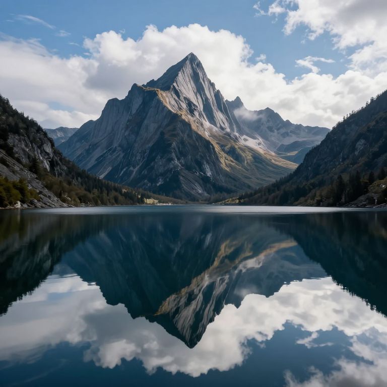 Surreal mountains rise majestically above a tranquil lake, their sharp peaks mirrored perfectly below, creating an illusion where nature defies gravity, roots extend skyward, and clouds reflect on the water's surface.