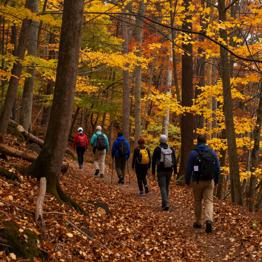 Excursion through a vibrant autumn forest, golden leaves falling around a group of hikers traversing a winding trail, soft sunlight filtering through colorful trees, realistic style with detailed textures and warm tones.