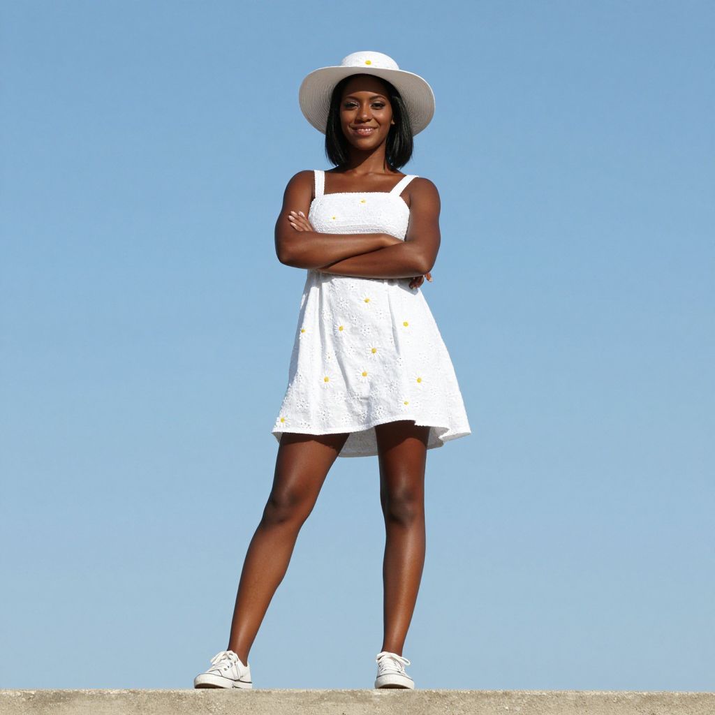 Photograph of a confident Black woman with dark skin, wearing a white sundress, wide-brimmed hat, and white sneakers, standing with arms
