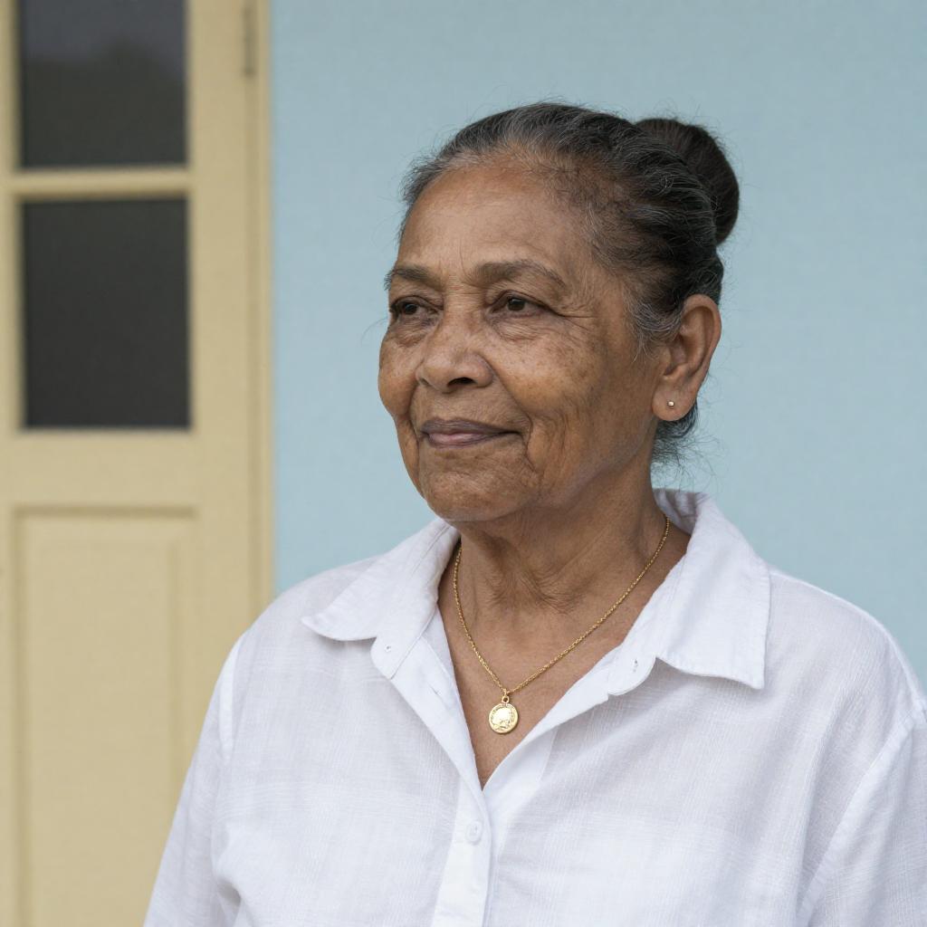 Photograph of an older woman with medium brown skin and dark hair in a bun, wearing a white, plaid, button-up shirt and gold necklace with a pendant. She has small earrings and is looking to the left with a slight smile. The background is a light blue wall with a yellow door and window on the left.