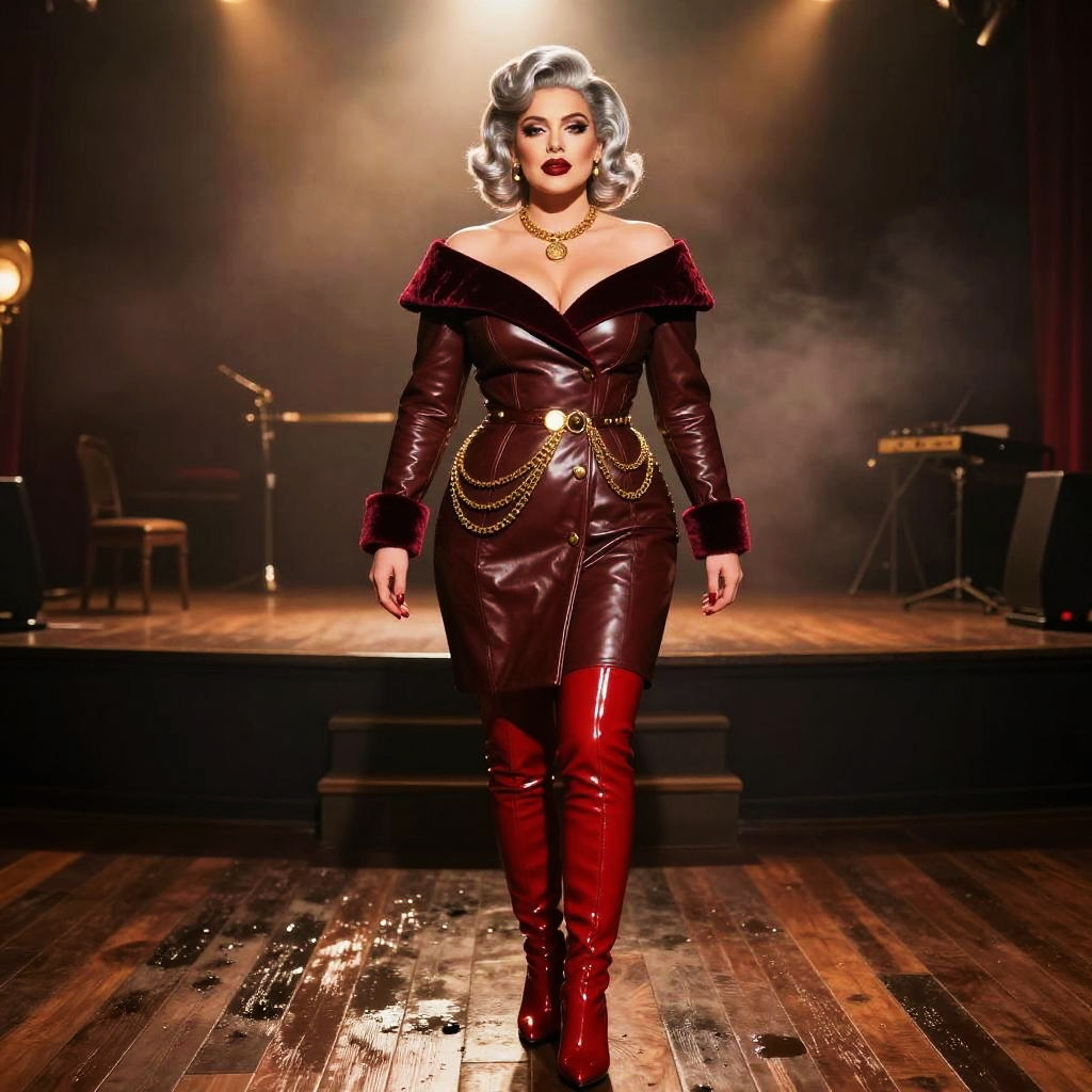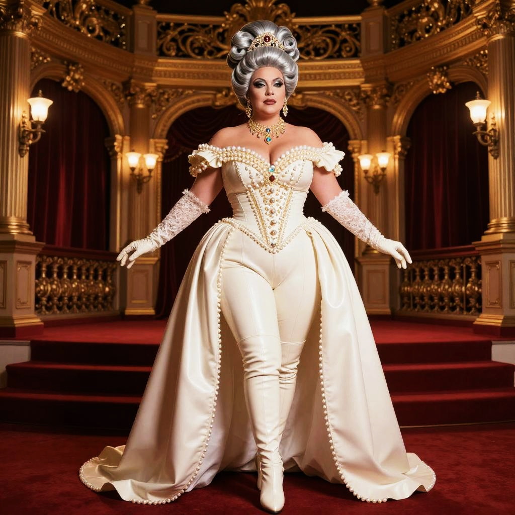 Image in the style of Rococo Revival Couture, seasoned opera diva, elaborate silver chignon with jeweled comb, full-figured matriarchal, (Leather & Latex Off-Shoulder Dress:1.3), ivory pearl-encrusted leather off-shoulder gown with matte-ivory thigh-high latex opera boots, lace elbow-length gloves and gold filigree collar, ornate gilded opera box with plush red velvet and warm spotlights studio background