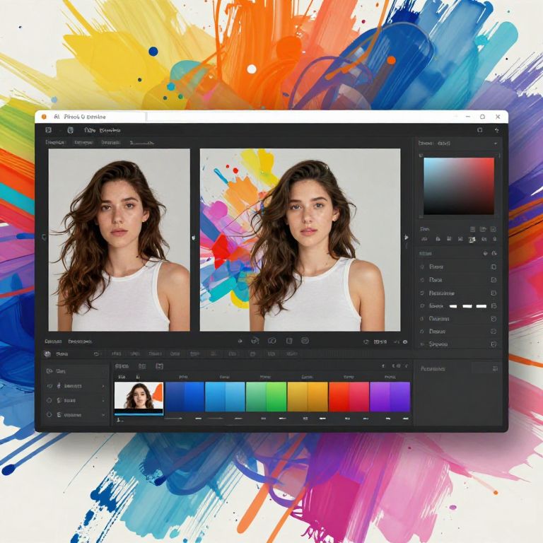 Free AI photo editor online visual concept, artistic blend of photo transformations with AI neural network graphics, colorful abstract background, digital brush strokes, futuristic UI elements, vibrant and dynamic composition showcasing advanced photo editing capabilities