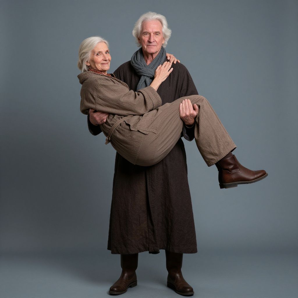 Photograph of an elderly white couple against a solid blue background. The man, with white hair and wearing a black long robe, dark boots, and a gray scarf, stands smiling while holding his elderly wife in his arms. She has short white hair, wears a brown long-sleeved top, matching brown pants, and brown boots, and smiles back at the camera. Her left arm is draped over his shoulder, and his right arm supports her back. The image is brightly lit, emphasizing their joyful expressions and the textures of their clothing.