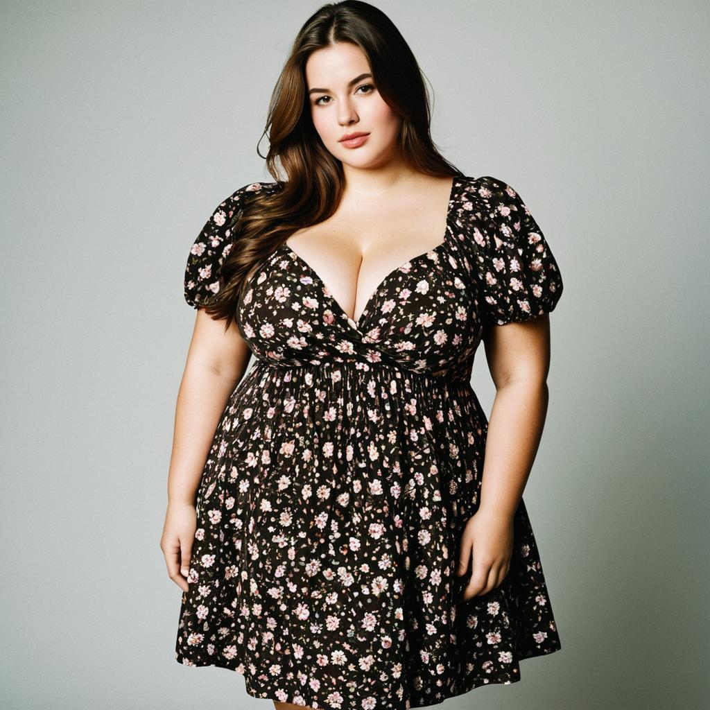 Plus size outfit overweight,1girl, solo, dress, brown hair, breasts, long hair, floral print, standing, looking at viewer, print dress, brown eyes, short sleeves, lips, cleavage, puffy sleeves