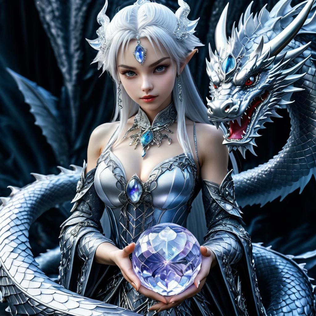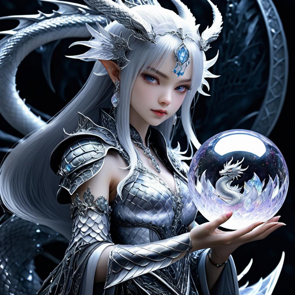Beautiful dragon-girl with silver scales holding a crystal orb, set in a dark fantasy world. Styled in high detail by Yoshitaka Amano.