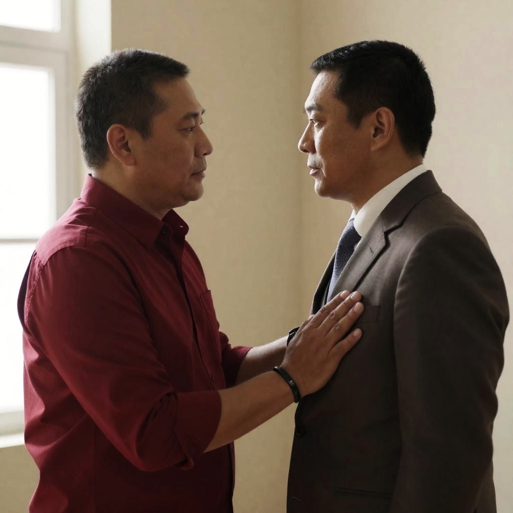 Photograph of two men in an emotional scene. Man on left, with short dark hair, white shirt, gripping other man's arm. Man on right, with gray hair, white shirt, looking serious. Background: curtains, lamp. Man on left's expression intense.