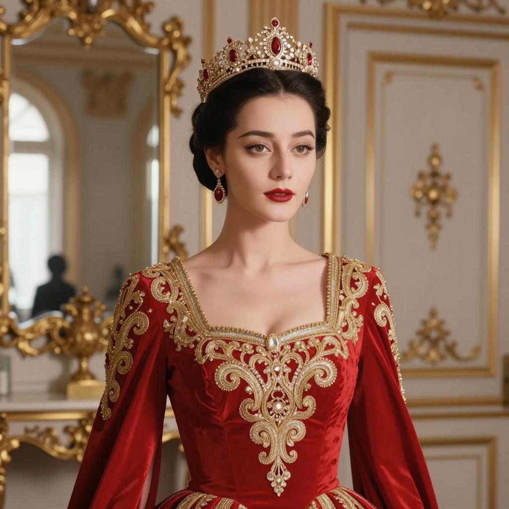 Portrait of a regal woman with fair skin and dark hair styled in a sleek bun. She wears a glamorous red carpet gown richly adorned with intricate gold embroidery and embellishments. Her look is accessorized with a jeweled gold crown featuring red and white gems, and matching elegant earrings. The opulent interior backdrop includes ornate gold-framed mirrors and classical decor, suggesting a sophisticated and high society ambiance.