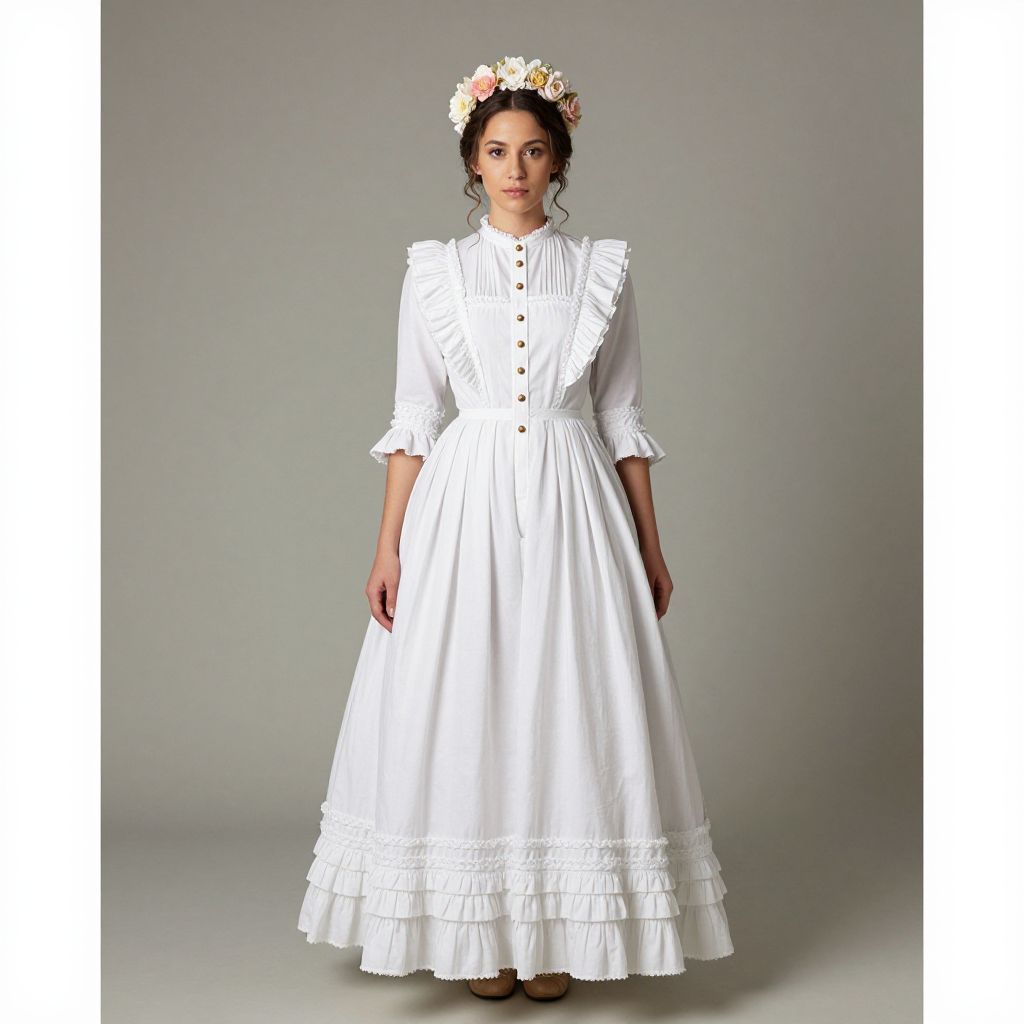 Woman wearing a pristine Southern Belle Civil War-era cotton ball gown with ruffled details, buttons down the front, and a matching floral headpiece, poised against a neutral backdrop.