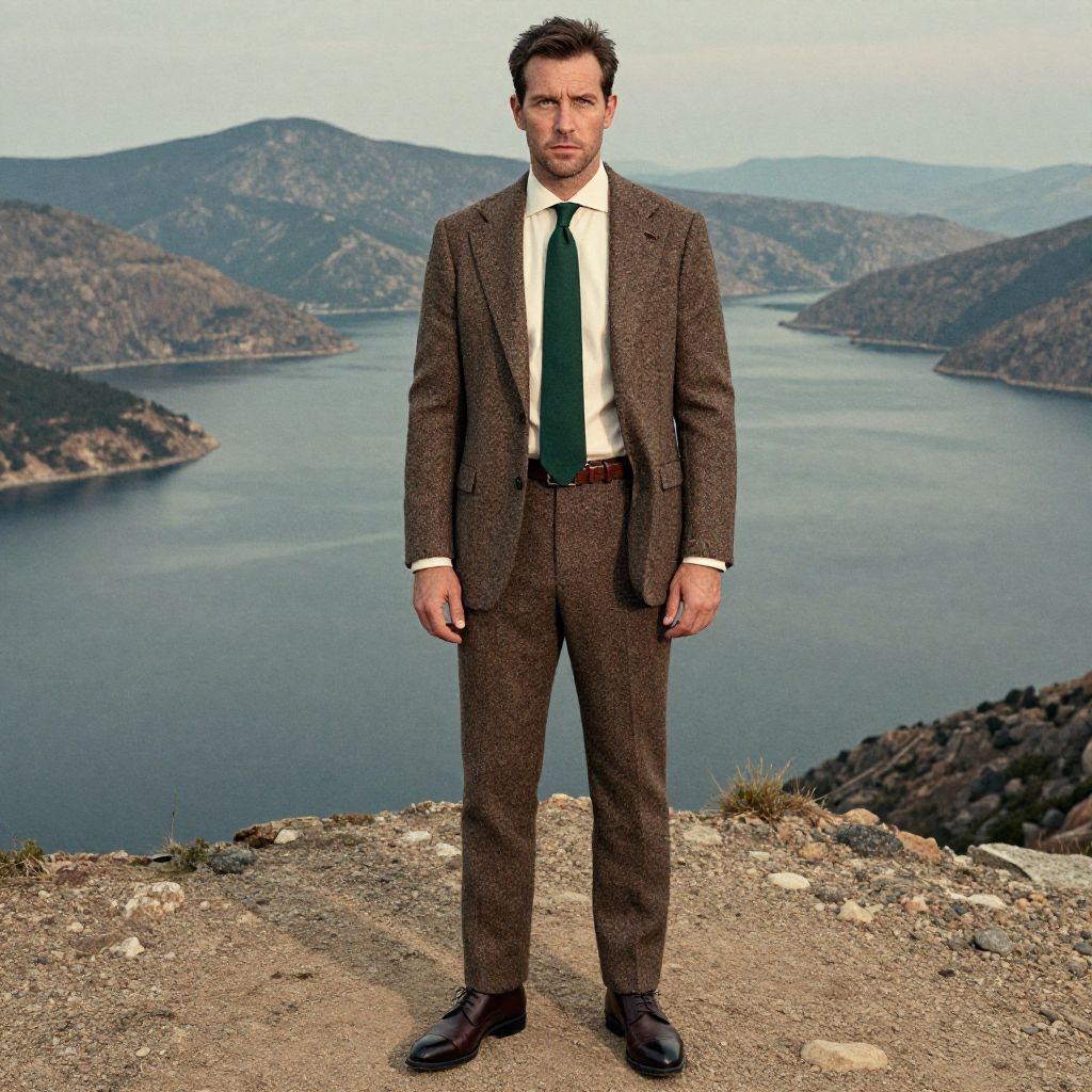 A man, rich brown herringbone wool suit, cream dress shirt, solid dark green tie, dark brown leather monk strap shoes, elegant brown leather belt, vast reservoir glistening, rugged mountains in the background, lithographic film style, confident expression. Man has masculine face and piercing eyes