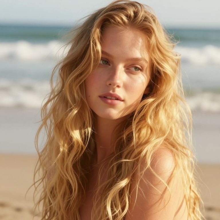 Group of blondes with green eyes laughing joyfully at the beach during golden hour, wind lightly tousling their hair, sparkling ocean waves behind, vibrant and warm color palette, realistic style with dynamic expressions