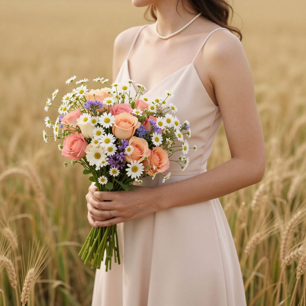 Woman standing in a golden wheat field, wearing a blush-colored spaghetti strap dress and holding a vibrant bouquet of flowers including white daisies, pink roses, and purple blooms, with a delicate pearl necklace adorning her neck.