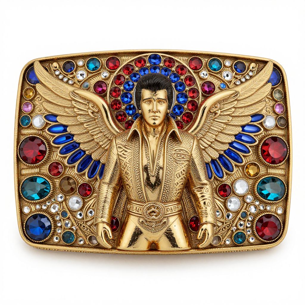 The image showcases a highly ornate belt buckle from Baz Luhrmann's ELVIS film. The buckle is rectangular with a rich, golden hue, adorned with intricate details and an array of vibrant gemstones. At the center, a figure with wings is depicted, exuding a sense of grandeur and elegance. The wings are detailed with feathers and are surrounded by a halo of blue and red gemstones, adding a touch of mystique. The figure is dressed in a classic Elvis Presley outfit, complete with a Nehru jacket and a belt with a decorative buckle. The surrounding area is embellished with a variety of gemstones, including blue and red crystals, arranged in a symmetrical pattern that frames the central figure. The overall composition is balanced, with the figure and gemstones creating a harmonious visual effect. The buckle's intricate design and vibrant colors make it a striking piece of jewelry, capturing the essence of the Elvis character in a visually stunning manner.
