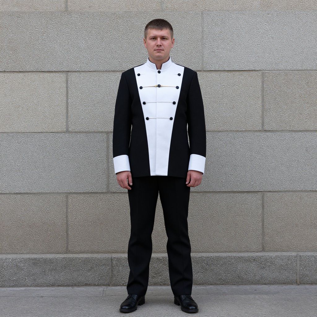 Russian Costume Man, man in a black and white uniform standing in front of a stone wall