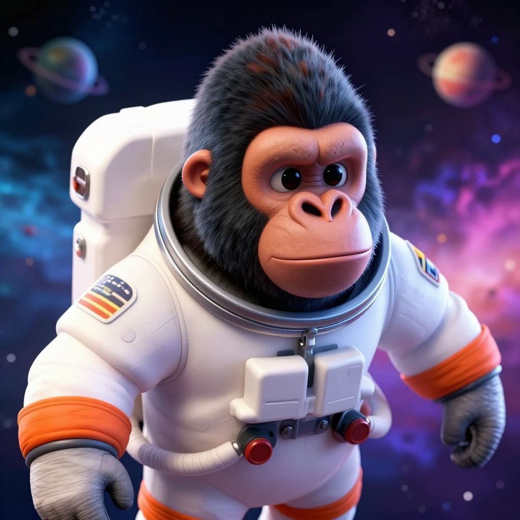 A digital CGI image of a cartoon-style anthropomorphic gorilla in a white astronaut suit with orange accents, floating in space. The gorilla has a black fur head, expressive brown eyes, and a pinkish nose. The suit features a backpack, American flag patch on the shoulder, and various buttons on the chest. The background showcases a vibrant, colorful nebula with planets and stars, adding a sense of depth and adventure to the scene. The gorilla's determined expression suggests readiness for space exploration.