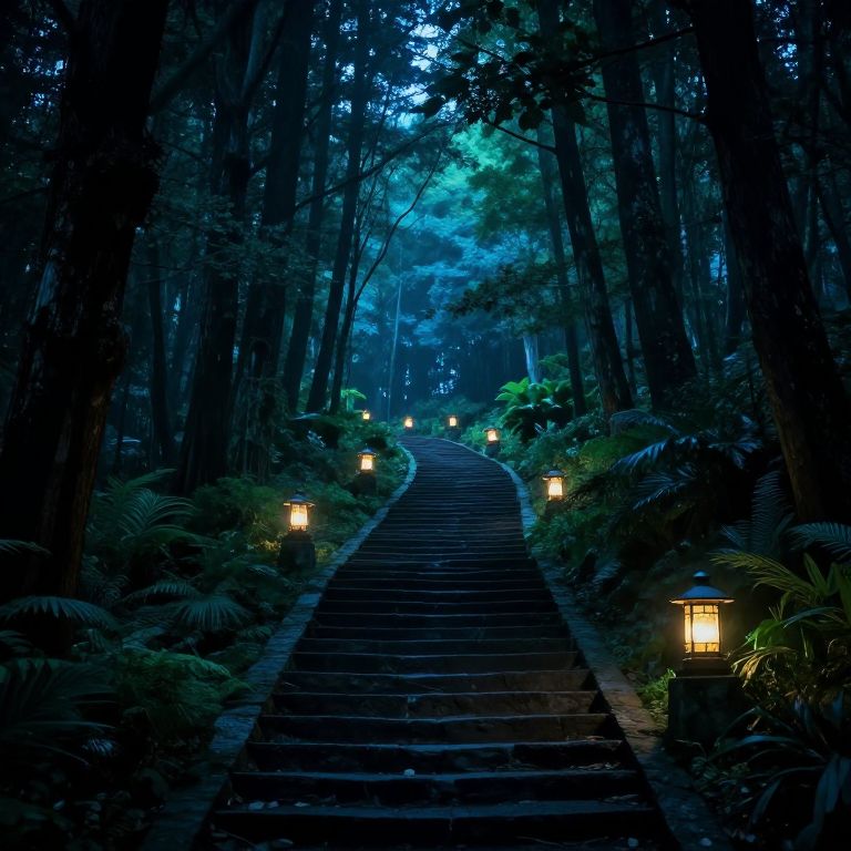 A mystical forest scene featuring an ancient moss-covered stone archway. Sunlight filters through tall evergreen trees as a stone pathway leads through dense green foliage. Lanterns embedded in tree trunks add a magical glow to the serene, dreamlike woodland.