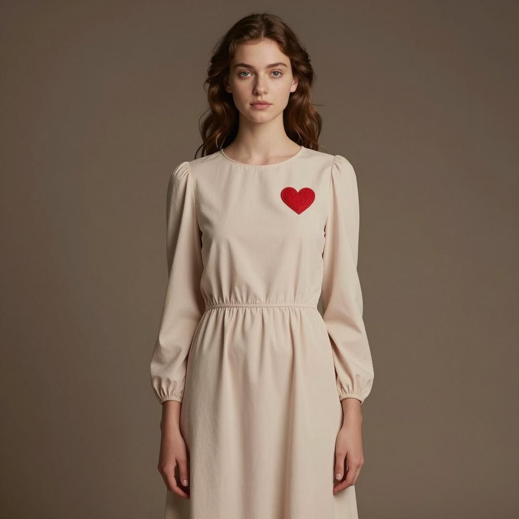 Portrait of a young woman with wavy brown hair wearing a beige long-sleeve dress featuring puffed sleeves and a red heart embroidery on the chest. She stands against a plain brown gradient background with a serene expression, showcasing a simple, elegant, and slightly vintage style. The dress has a subtle texture and a gathered waist design.