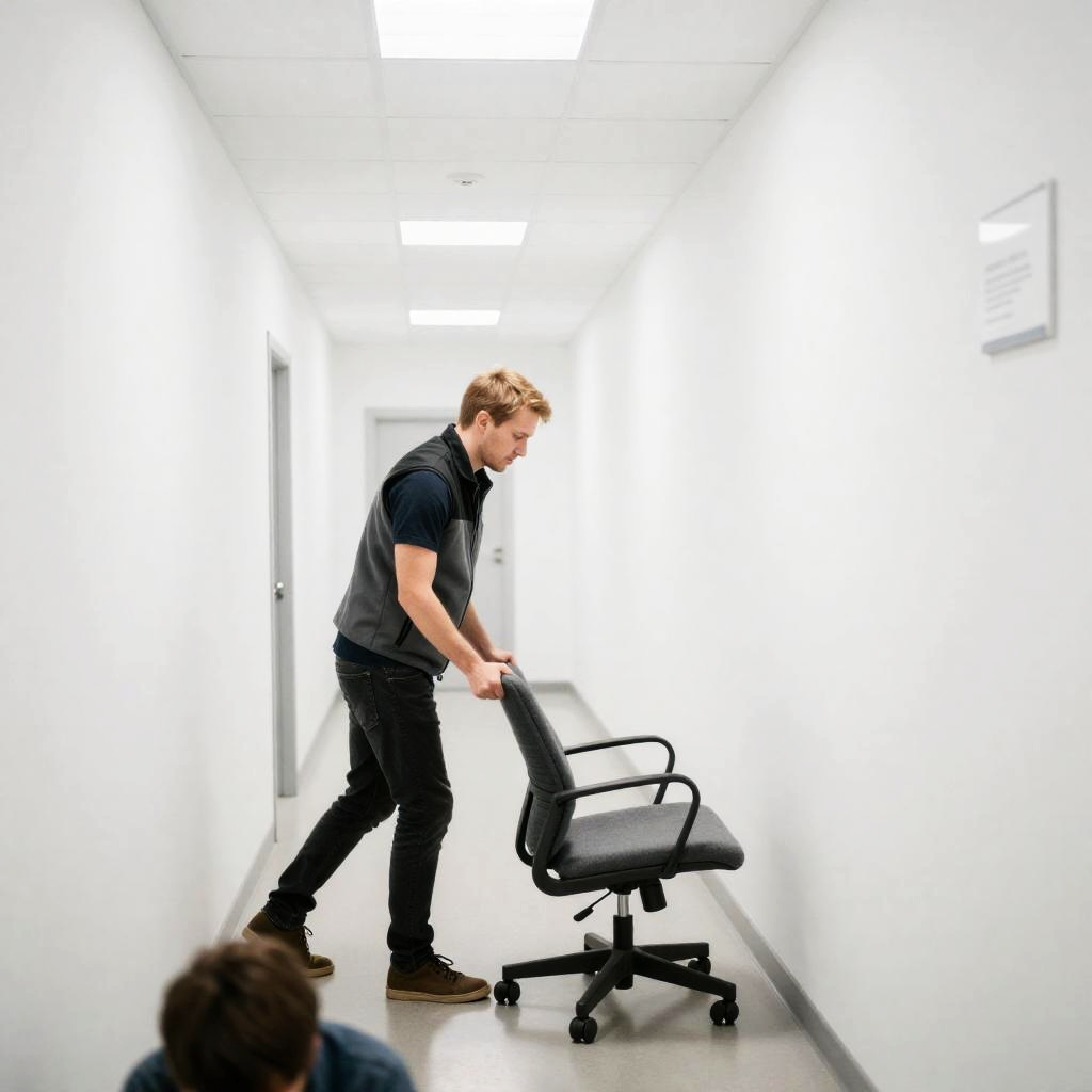 Man with short blonde hair, wearing a grey and black vest over a dark shirt and dark jeans, pushes a large, gray office chair along a white-walled, fluorescent-lit hallway. Another person with brown hair is crouched in the foreground. Ceiling tiles and a sign on the right wall are visible.