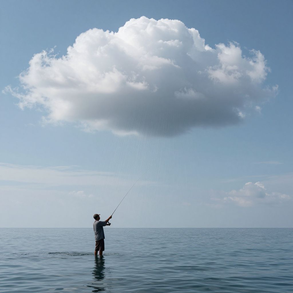 A solitary fisherman stands in a tranquil sea, casting a line upward toward a massive cloud that rains down delicate threads, defying gravity and merging the realms of sky and water in a surreal, dreamlike tableau.