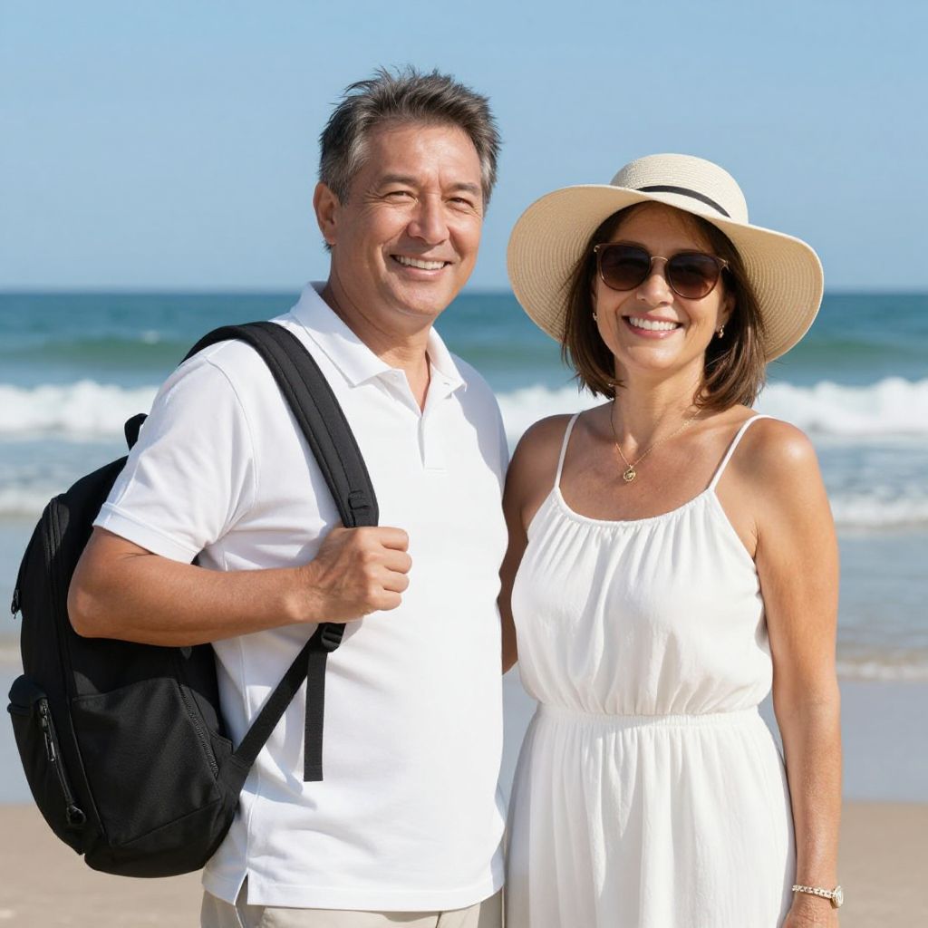 Mature couple enjoying a sunny beach day, dressed in light summer attire, with the man wearing a white polo shirt and carrying a black backpack, while the woman dons a wide-brimmed beige hat, sunglasses, and a flowing white sundress, both smiling brightly against the backdrop of calm ocean waves and clear blue skies.