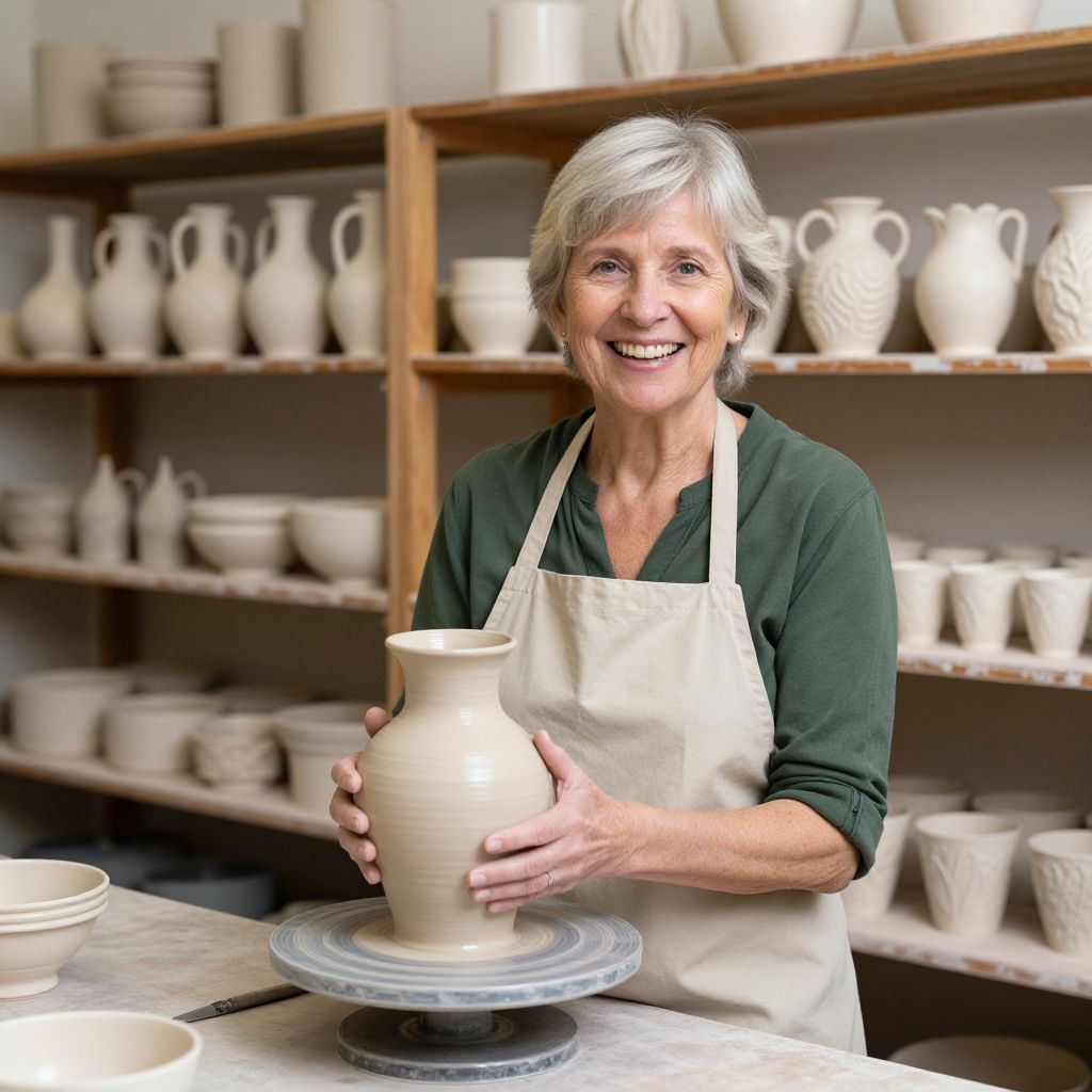 Photograph of an older woman with short gray hair and a green long-sleeve shirt, wearing a white apron, smiling while holding a freshly made, beige ceramic vase on a pottery wheel. The background features wooden shelves filled with various beige ceramic dishes, bowls, and vases. The woman is centered in the image, with the pottery wheel and shelf full of ceramics behind her, creating a warm, artisanal atmosphere. The image has a high contrast, emphasizing the textures of the pottery and the woman's joyful expression.