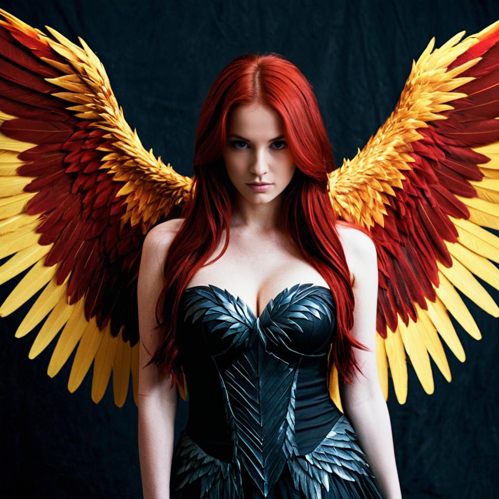 Phoenix costume,1girl, solo, wings, red hair, long hair, dress, bare shoulders, breasts