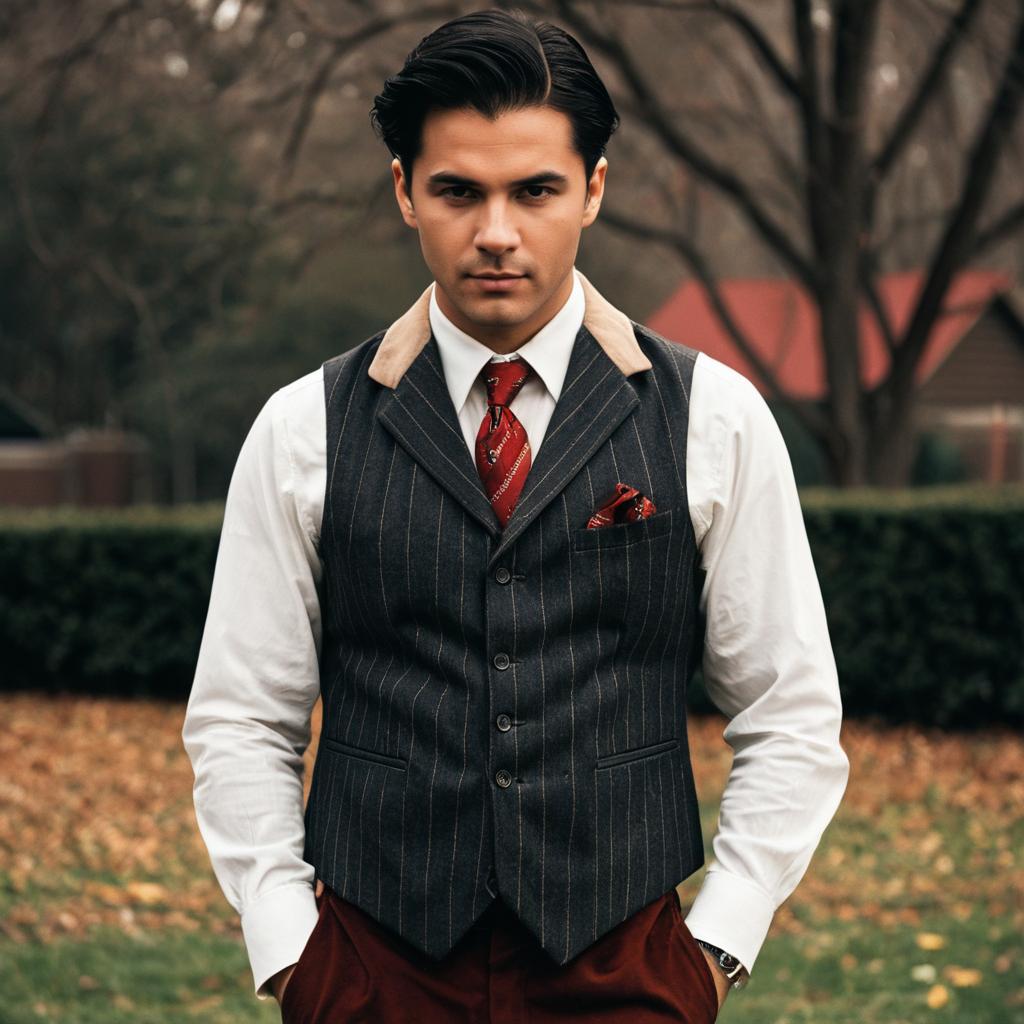 Portrait of a young man wearing a vintage gangster Gatsby-style costume outdoors. He is dressed in a white collared long sleeve shirt, dark pinstripe vest with tan collar, red necktie, matching red pocket square, and brown trousers. The man has black short hair styled neatly and a confident facial expression, standing with hands in pockets in an autumn setting.