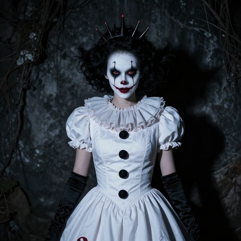 A spooky CGI image of a pale-skinned, creepy clown-like figure with black hair and red eyes. The character has a white face with black makeup, red lips, and a crown of black spikes with red tips. They're wearing a white, buttoned-up dress with black buttons and long, black gloves. The background is a dark, rocky wall, adding to the eerie atmosphere.