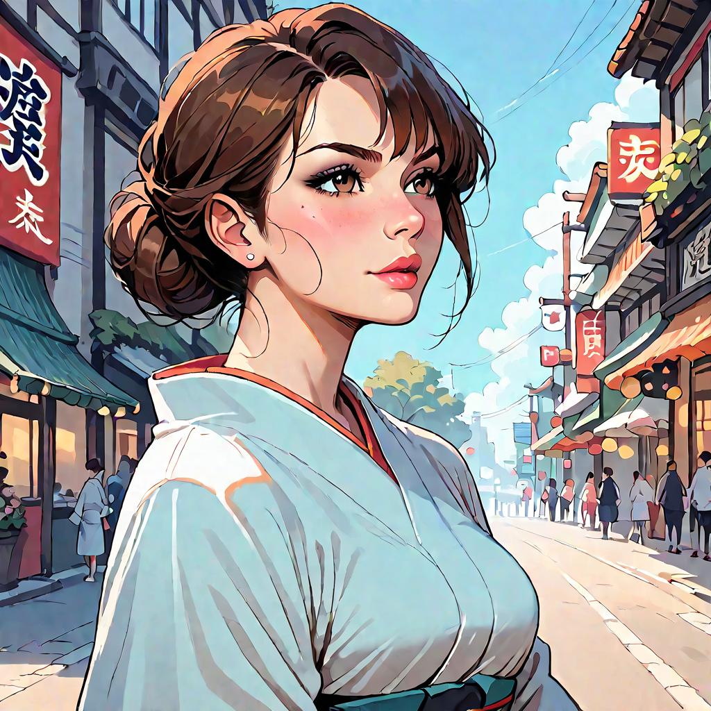 Score_9, score_8_up, score_7_up, best quality, masterpiece, anime, old woman, solo, nasolabial folds, brown hair, bun, serious, open mouth, kimono, looking away, tokyo street, upper body