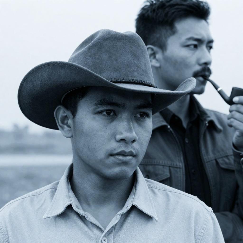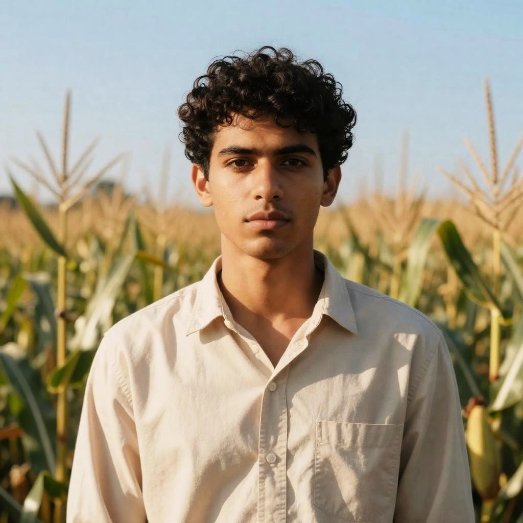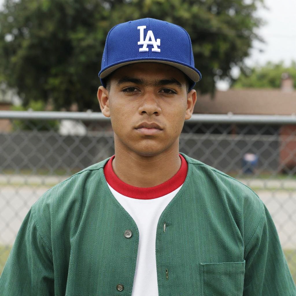 Photograph of a man in a blue baseball cap, orange shirt, holding a baseball glove, intense gaze, right profile, red grass field background, yellow-orange sky, old pickup truck in distance, slightly hazy.