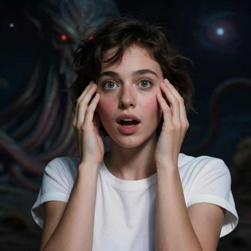 Photorealistic portrait of a young Caucasian woman with short messy black hair and light gray eyes, wearing a white t-shirt. She has her hands on her face in a surprised expression with an open mouth. The background features a dark, cinematic depiction of Cthulhu, the mythical elder god, with glowing red eyes. The image uses soft natural and volumetric lighting, capturing intricate skin texture and a hyper-realistic appearance with high detail and sharp focus.