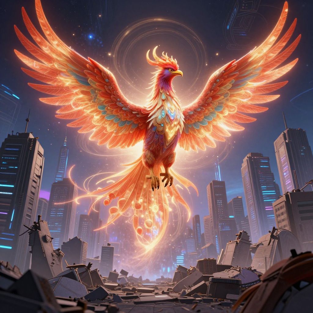 Imagine a surreal dreamscape where a grand phoenix gracefully glides through an ethereal nebula, reminiscent of melting timepieces and bio-mechanical designs. From a unique perspective, akin to a 'bug's-eye view', observe the intricate patterns on the phoenix's feathers that resemble flames as it traverses a landscape interwoven with nature-inspired entities and technology-infused architecture. This scene should stir emotions ranging from admiration to astonishment, encapsulating the infinite beauty and untapped potential of the cosmos within an enchanting, otherworldly composition.