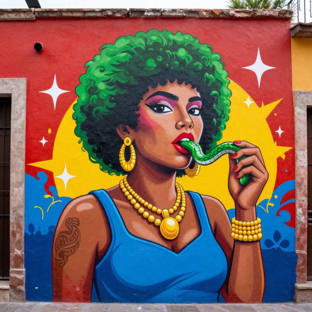 Vibrant mural of a dark-skinned woman with green afro, wearing blue tank top, gold jewelry, licking green snake, against red-yellow