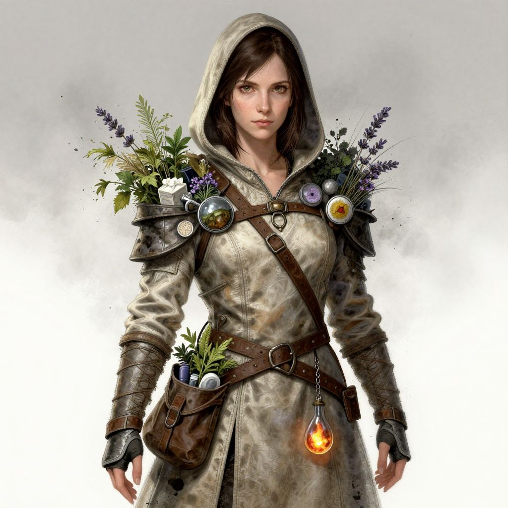 Medieval fantasy, partially obscured, inksplash portrait, stunning, direct gaze, light hitting one side of face, gradient colour background, semi-realistic, anime, breathtaking, cinematic, close up, full body shot, dutch angle, Maren Eddral, She wears light leather armor with pouches brimming with herbs, potions, and strange powders, Medic and Alchemist, Quietly determined and deeply empathetic, Her knowledge of healing is rivaled only by her resourcefulness in creating battlefield remedies, First aid, herbalism, and crafting alchemical tools like smoke bombs or healing salves, Maren is a slender woman in her mid-20s with a soft, oval-shaped face and pale, almost porcelain skin, Her dark brown hair is cropped short for practicality, and her hazel eyes are warm but observant, She wears a hooded leather coat with numerous pockets and satchels, filled with herbs, salves, and alchemical supplies, A thin line of ash-colored paint runs under her eyes to reduce glare, and the faint scent of lavender and mint lingers around her, A small, glowing vial dangles from a chain at her waist—a concoction she claims can repel Fireth