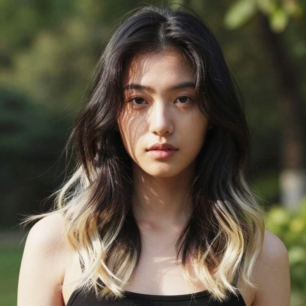 Frosted tips black hair on a cool female model, soft waves with platinum blonde tips, natural makeup, sunlit outdoor scene with blurred greenery, fresh and stylish vibe