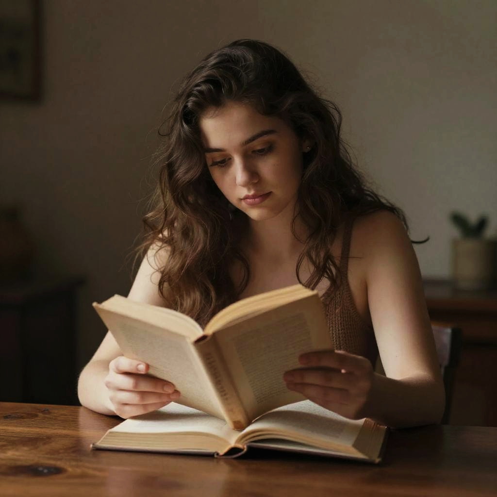 (RAW photo, best quality), (realistic, photo-realistic:1.3), extremely delicate and beautiful, Amazing, finely detail, masterpiece, ultra-detailed, highres, best illustration, best shadow, intricate, depth of field, A beautiful girl wearing a brown knit bottom is reading a book, Smooth wooden table, Center the composition, Waist Shot, beautiful lighting, Portrait Photography, 1girl, (long legs:1.4), sharp focus, volumetric fog, 8k UHD, DSLR, high quality, ( film grain:1.4), long hair, messy hair, ((((low key, dark scene, dimly lit)))), fat, (((soft lighting:1.4))), (shy smile)